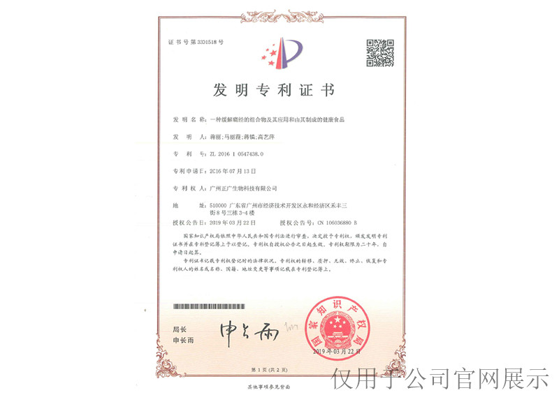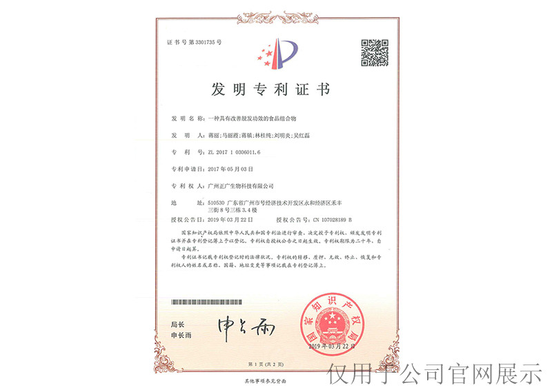 • 一種具有改善脫發(fā)功效的食品組合物 授權(quán)專利證書(shū)