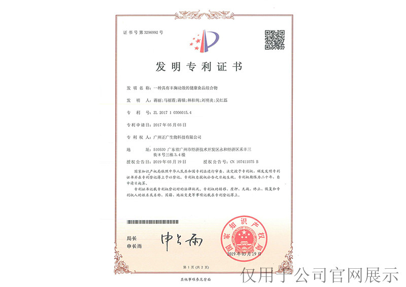 • 一種具有豐胸功效的健康食品組合物 授權(quán)專利證書(shū)